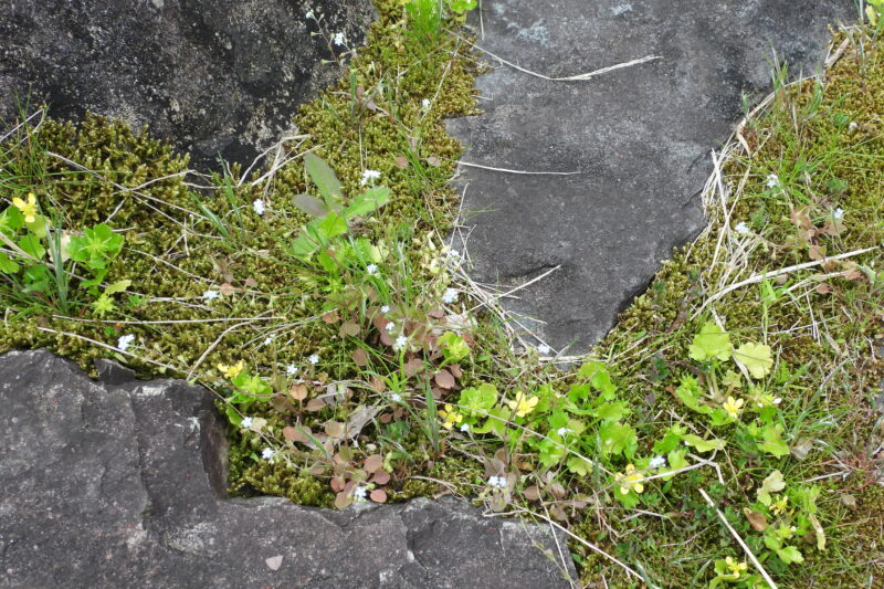 スミレ、ヒメスミレ、ツボスミレ、アリアケスミレ、ナガバノタチツボスミレ、雑種タンポポ、サワオグルマ、オニタビラコ、ヘビイチゴ、コメツブツメクサ、カタバミ、ジシバリ、マツバスゲ、カサスゲ、オランダミミナグサ、ミミナグサ、ノミノフスマ、ノミノキンチャク、オオバタネツケバナ、サギゴケ、トキワハゼ、ハルジオン、スズメノエンドウ、カラスノエンドウ、カスマグサ、スズメノヤリ、スズメノカタビラ、スズメノテッポウ、ヤマスズメノヒエ、コバノガマズミ、クロモジ