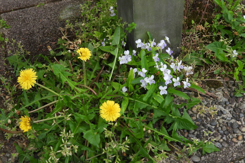 総苞片が中途半端に反り返った雑種タンポポとピタッとくっついた雑種:ニセカントウタンポポを比べました。芝生に帰りスミレ、アリアケスミレ、ヒメスミレを比べました。