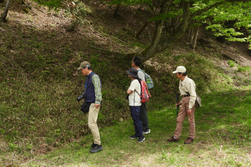 最後はビオトープの奥まで入って、シカの害で丸裸の林床や背が低くなったネザサを見ました。