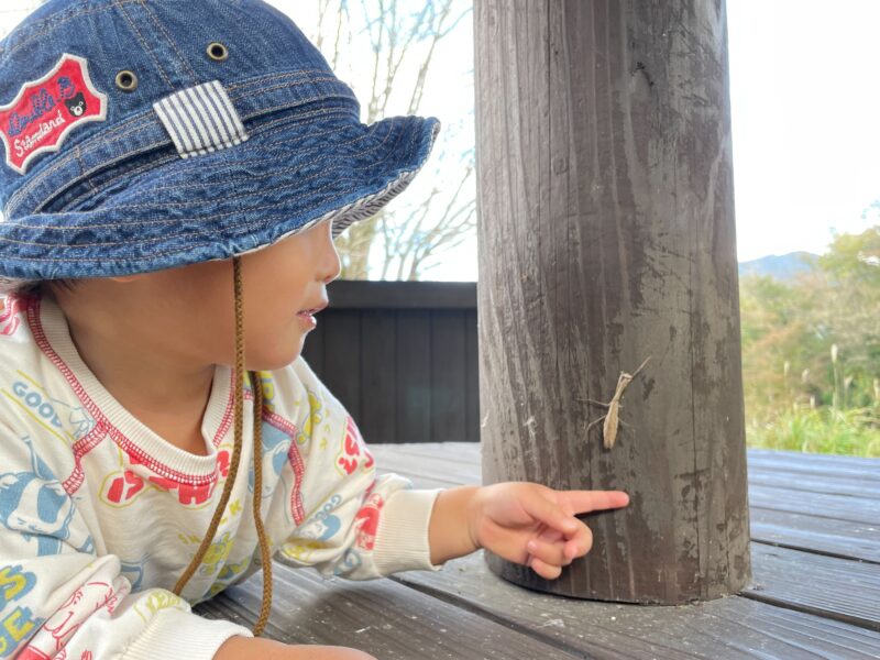 朝から雨模様でしたが、お日様が顔を出し、ソヨゴの葉っぱの音を聞いたり、ムクノキを触ったりしながら、ゆっくりとお散歩しました。トンボやキノコ、コカマキリにも出会えました。