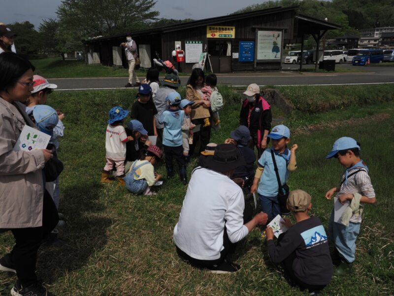 春のあぜ道はタンポポの黄色以外に青や紫など多くの色があります。あぜ道を歩きながら色々な花の色を探してもらったり、葉っぱのつき方を見てもらいました。毛の生えた葉や四角い茎をもった植物は実際に触ってみてもらいました。